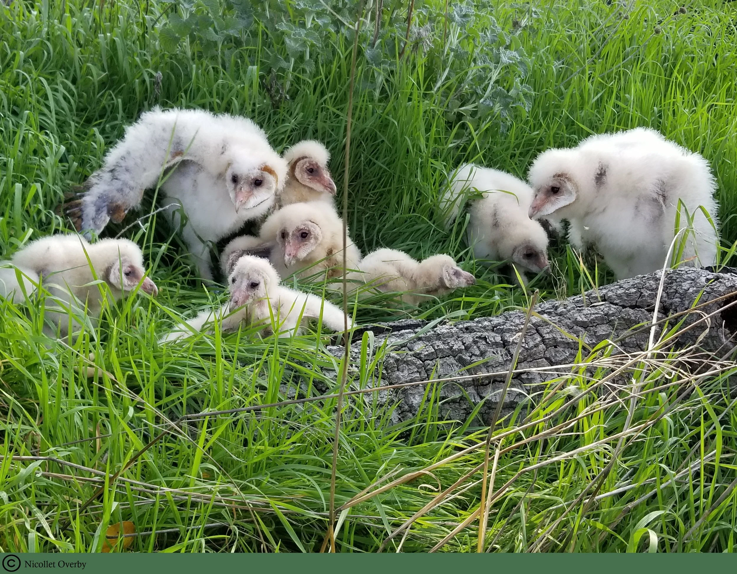 In this photo, you can see the various ages/sizes of this brood of eight chicks, all from one nest box. These chicks were temporarily on the ground during a permitted banding project.